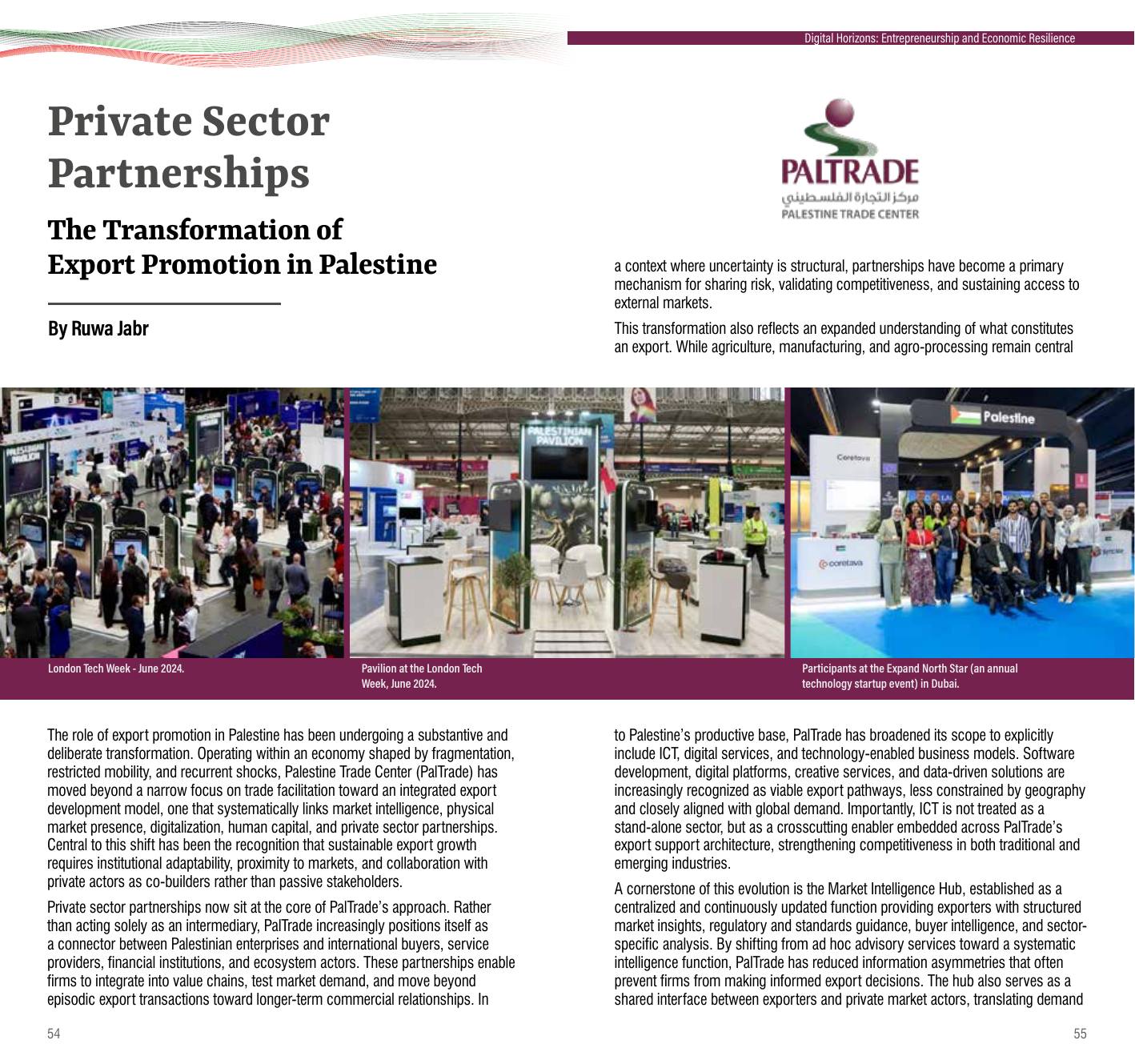 Titled “Private Sector Partnerships: The Transformation of Export Promotion in Palestine” by Ruwa Jabr, the piece highlights PalTrade’s shift toward an integrated model that connects the Market Intelligence Hub with on-the-ground market presence and export infrastructure (including the Rotterdam warehouse), while expanding support to ICT and digital services—turning insights into sustained commercial opportunities.