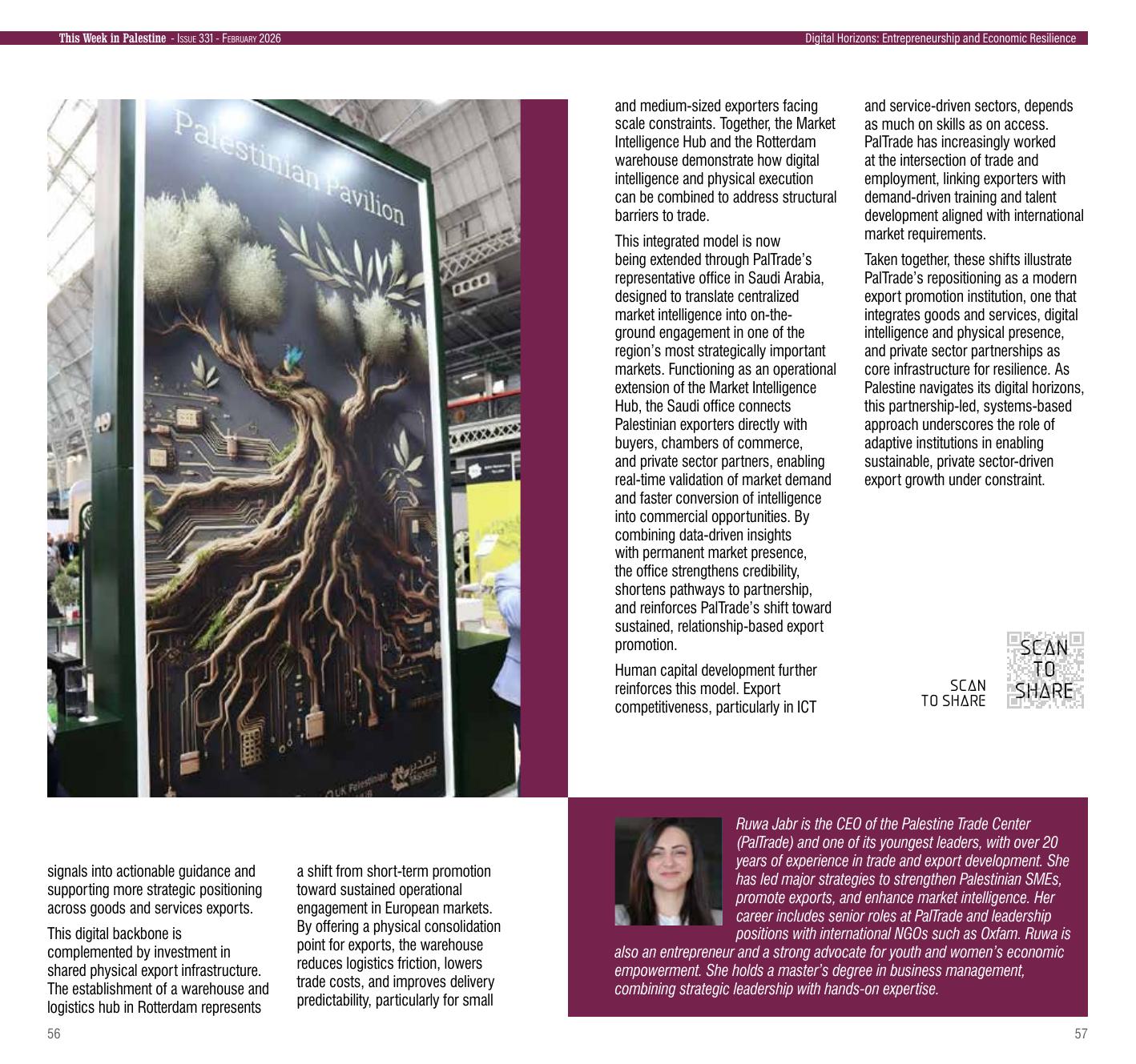 In This Week in Palestine – Issue 331 (February 2026), under Digital Horizons: Entrepreneurship and Economic Resilience, Palestine Trade Center – PalTrade is featured in an article spotlighting the role of private sector partnerships in reshaping export promotion in Palestine.